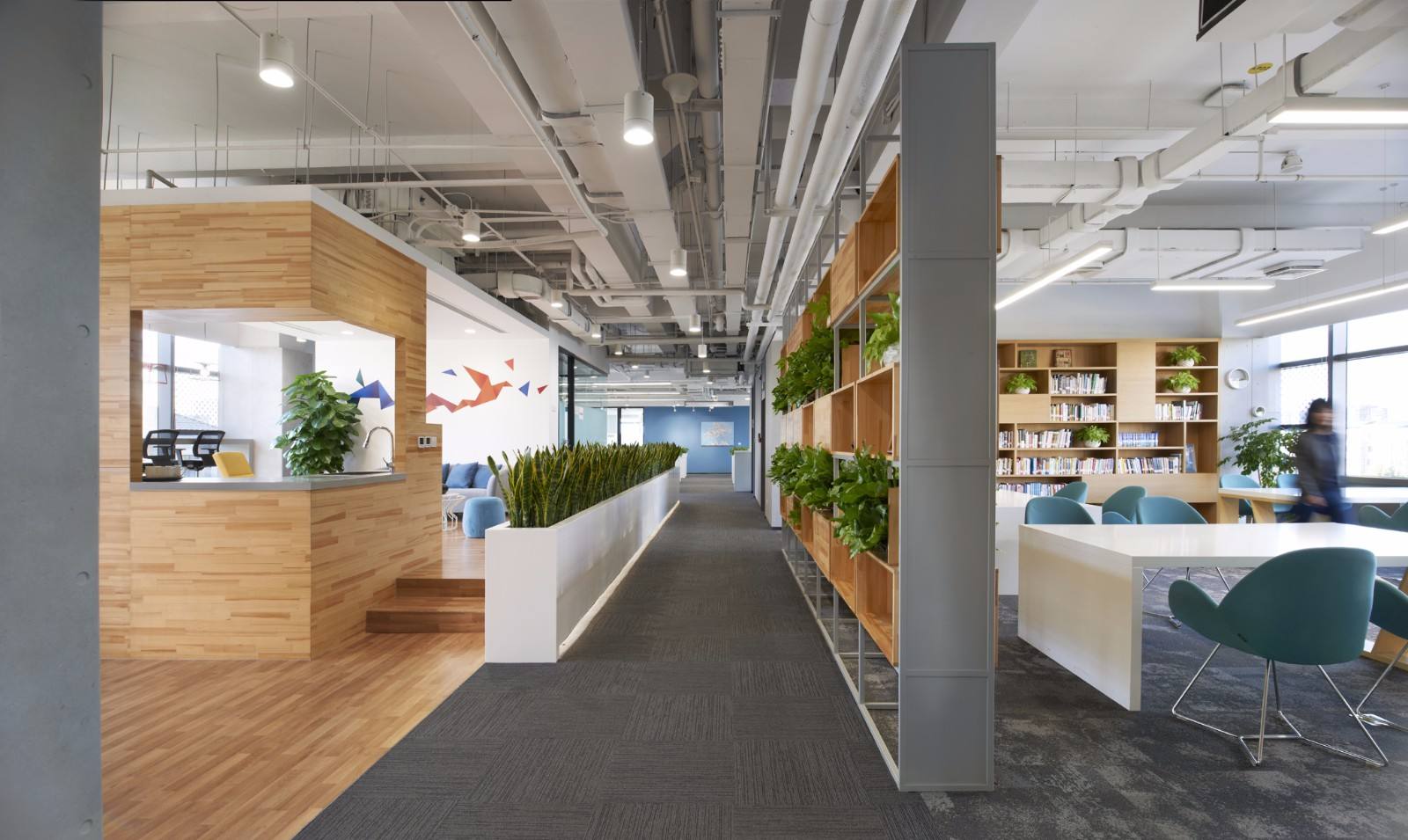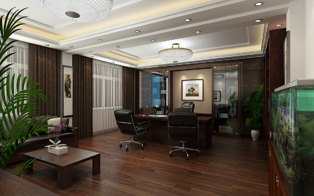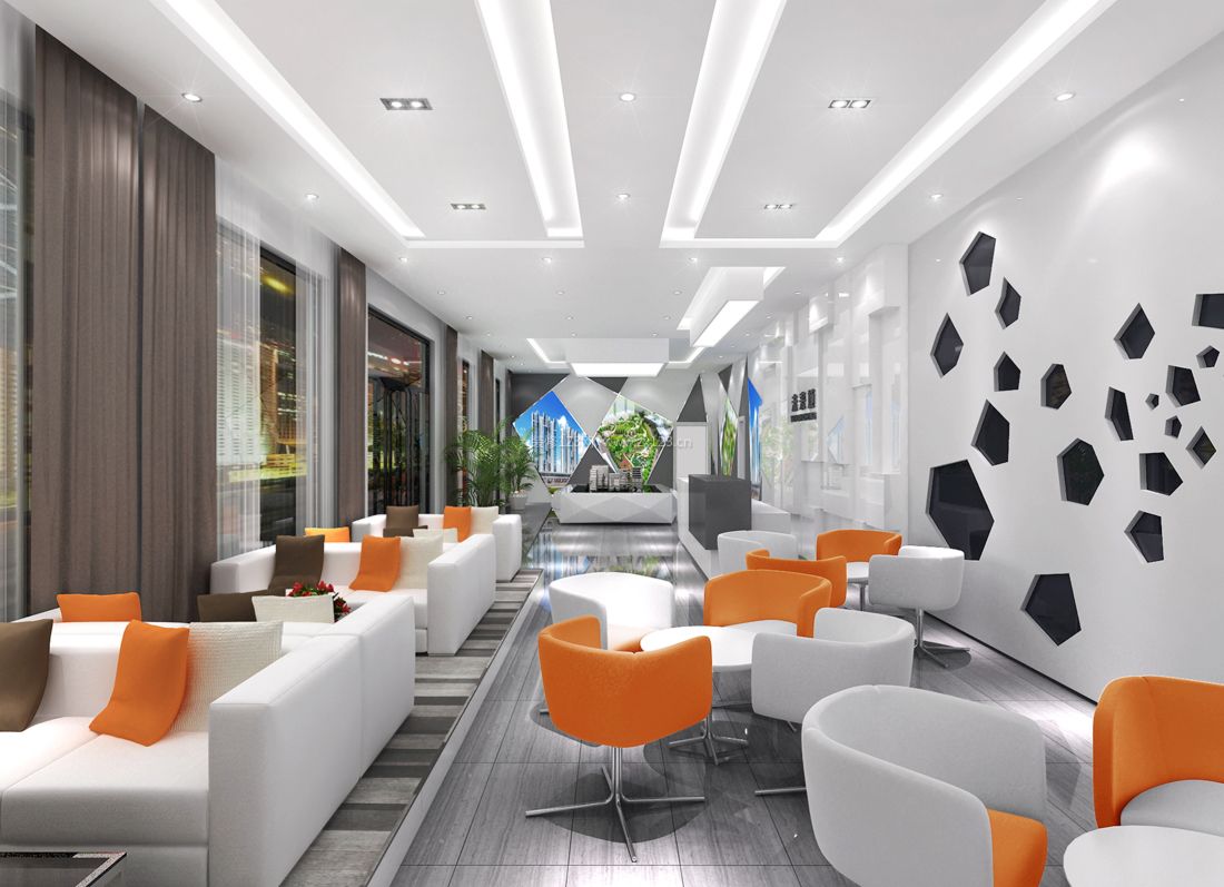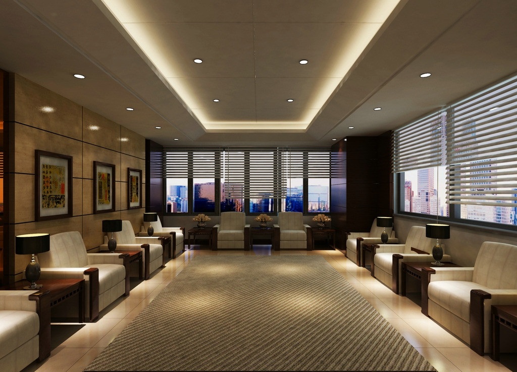 案例說明:本案設(shè)計為突顯建筑開間較舒適之優(yōu)點,設(shè)計師特意設(shè)計了過道各柱體間鑲嵌不銹鋼條及玻璃幕墻上的磨砂條來點綴的裝修主題,同時,地面用拼花色帶打破,與方正而美觀的吊頂上下呼應(yīng);辦公室靠近走道的墻面,為將自然光透入走道,同時又加強(qiáng)其“靈透”感,采用清玻幕墻,幕墻上的磨砂條既打破了玻璃墻面的呆板,又提醒了行人幕墻的存在,防止無意識碰頭、沖撞等類似意外發(fā)生;為辦公室的后續(xù)私密性考慮,其清玻幕墻內(nèi)掛以百葉窗遮擋既可。
